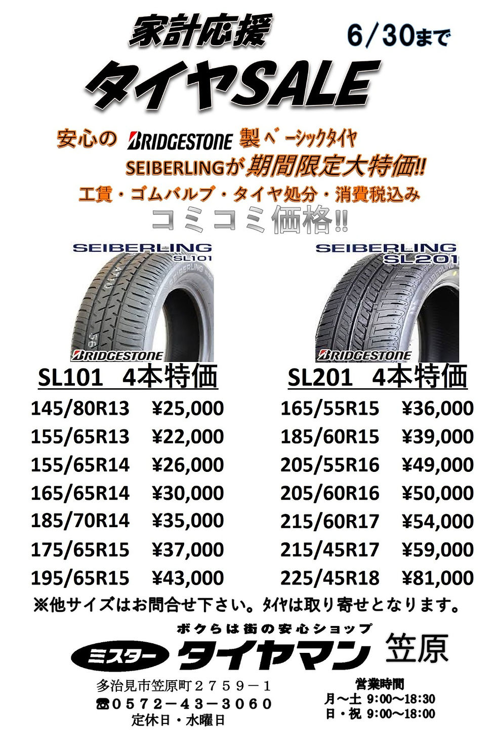 家計応援タイヤセールのお知らせミスタータイヤマン笠原2022年6月12日読了時間: 1分更新日:2022年7月29日ミスタータイヤマン笠原では、6月30日(木)まで家計応援タイヤセールを実施中です。期間限定の大特価!この機会にぜひご来店ください!スタッフ一同みなさまのご来店お待ちしております